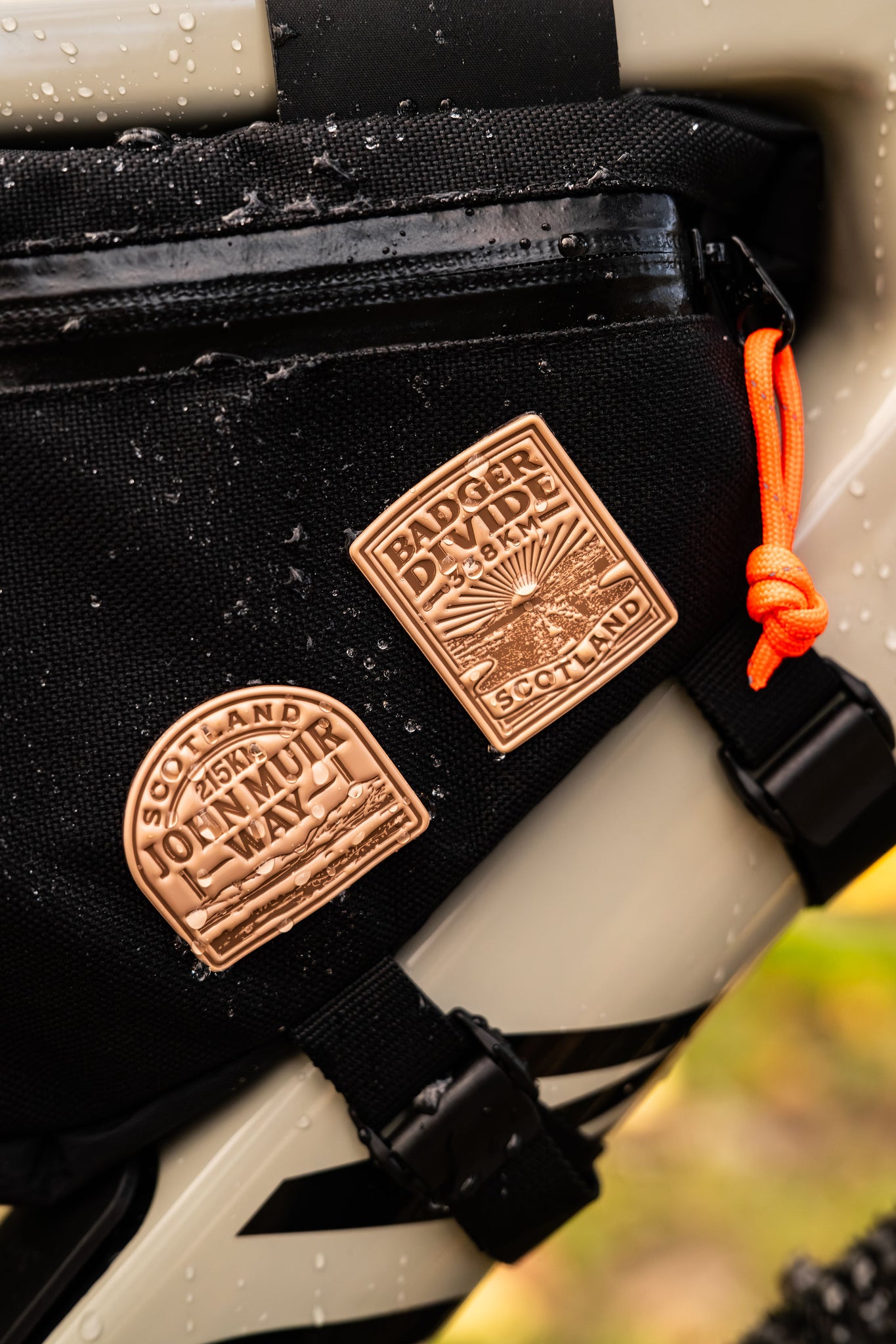 John Muir Way bikepacking patch - Celebrate your cycling adventures with this weatherproof, self-adhesive patch. Perfect for personalising bikepacking bags and marking memorable rides – just peel off the backing and stick it in place!