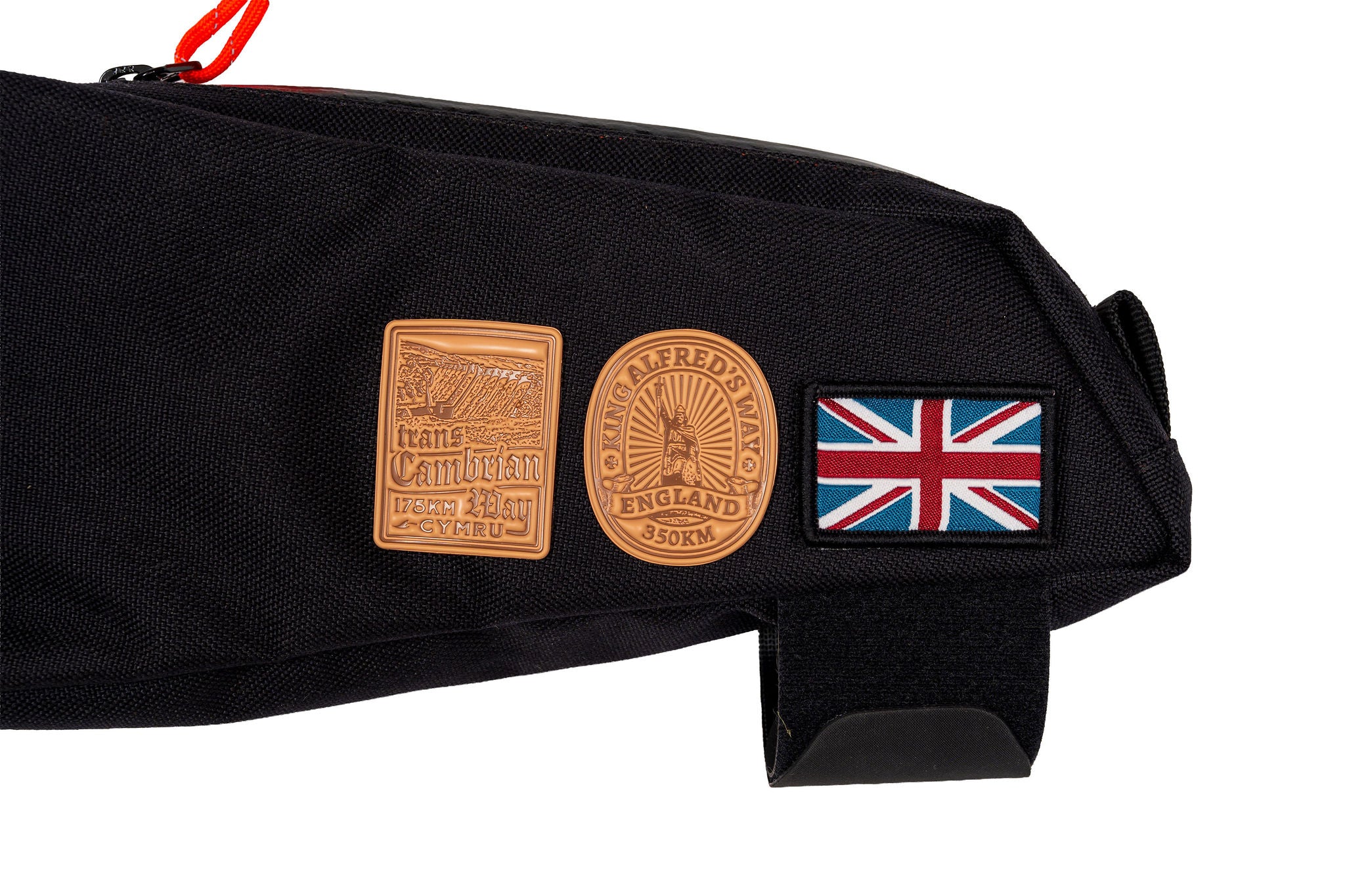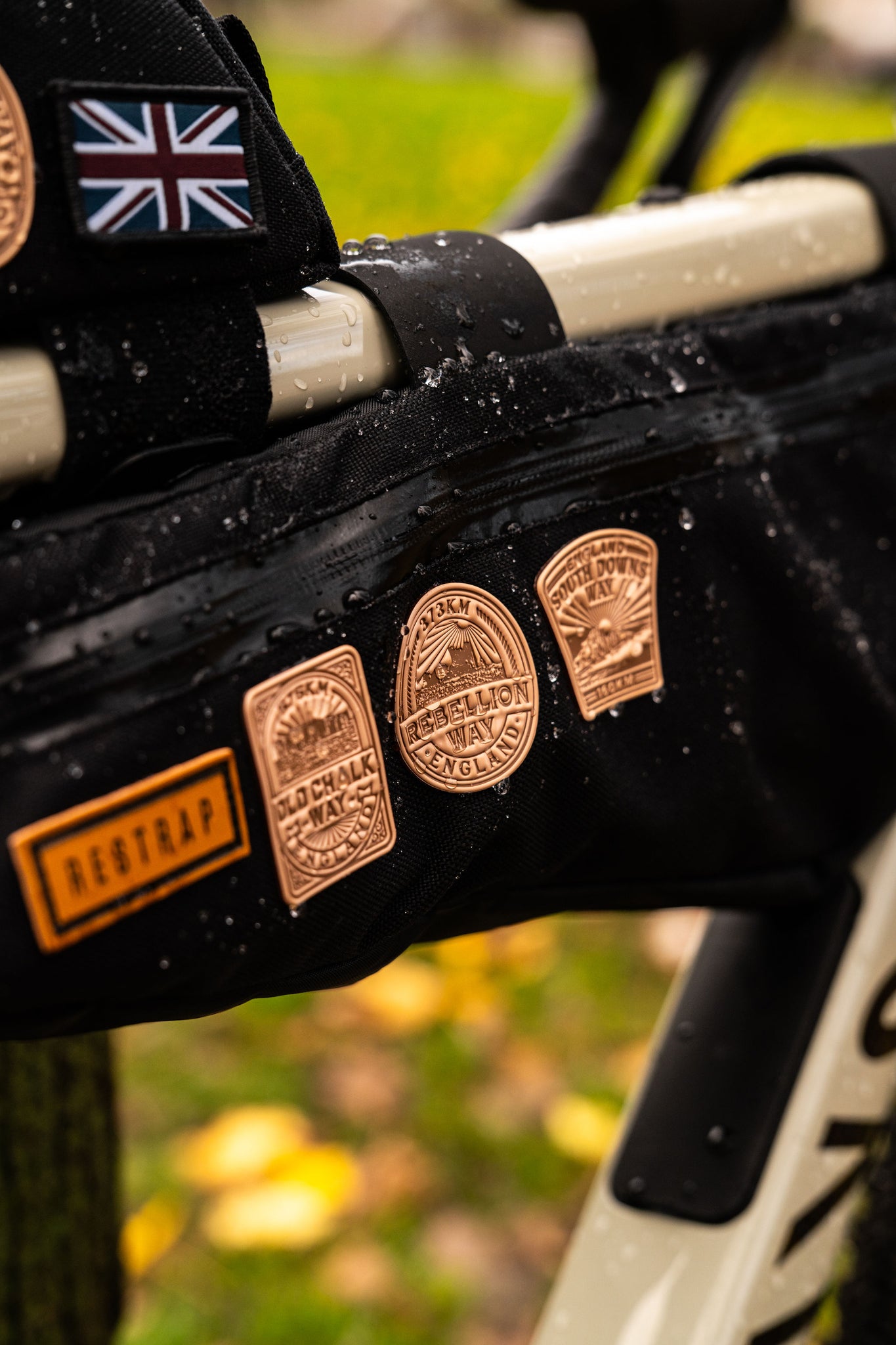 King Alfred's Way bikepacking patch - Celebrate your cycling adventures with this weatherproof, self-adhesive patch. Perfect for personalising bikepacking bags and marking memorable rides – just peel off the backing and stick it in place!