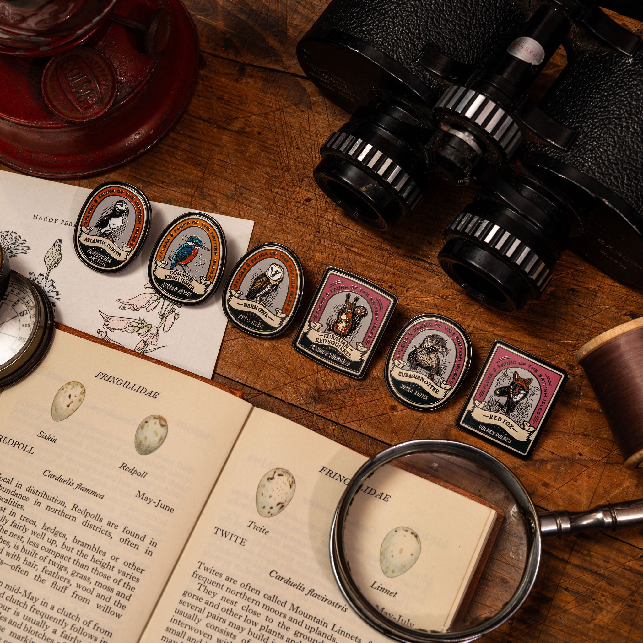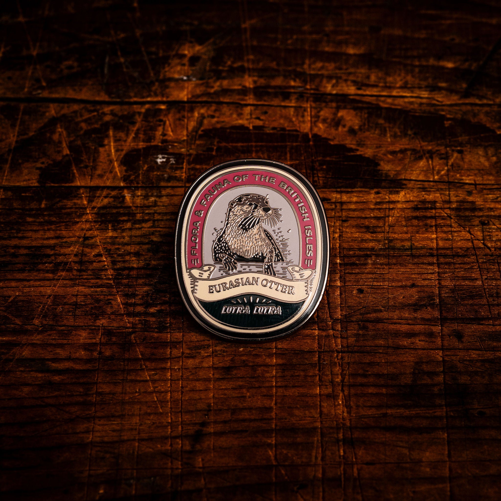 Eurasian Otter pin badge - inspired by vintage nature journal illustrations, the inclusion of the Latin name gives these pins something of an encyclopaedic vibe.
