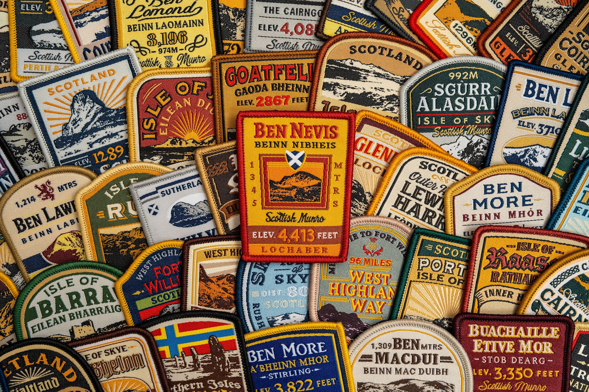 Ben Nevis woven patch - taking a wee dram of inspiration from vintage malt whisky labels, mark your munro and Corbett bagging adventures with our range of Scottish Mountain patches